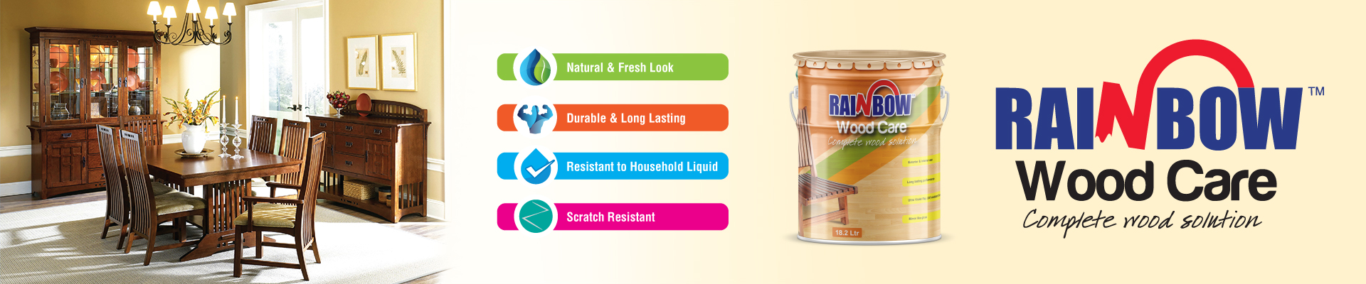 Rainbow Wood Care is Polyurethane base coating solution which is used on wooden objects and board. It ensures maximum quality of lacquer finish. Wood Care protects wood from water and other liquid substances even it give protection from scratch.